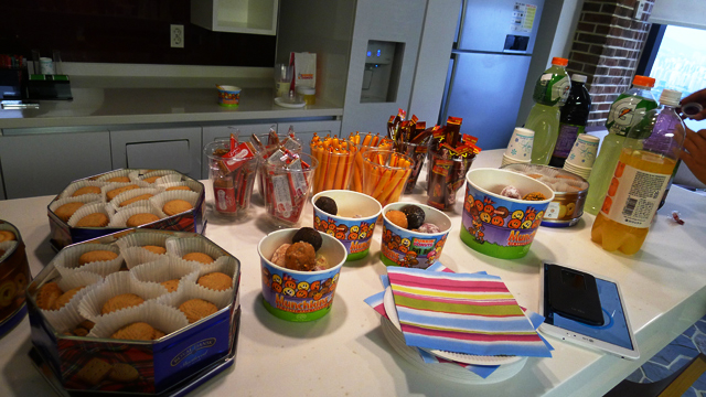 쿠키, 소시지, 음료등 다과가 준비되어 있다