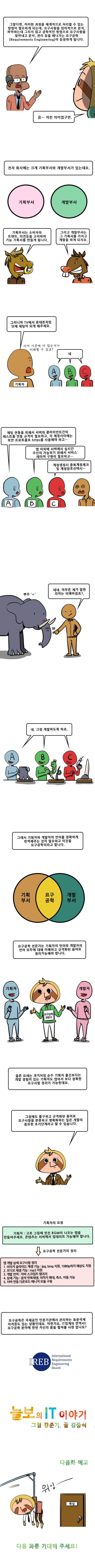 ## 교수 : 그렇다면, 이러한 과정을 체계적으로 처리할 수 있는 방법이 필요하게 되는데, 요구사항을 임의적으로 분석, 파악하는데 그치지 않고 공학적인 방법으로 요구사항을 찾아내고 분석, 관리 등을 해나가는 요구공학(Requirements Engineering)이 등장하게 됩니다. 늘보 : 음… 이런 의미였구만. ## 나레이션 : 전자 회사에는 크게 기획부서와 개발부서가 있는데요. 소책임 : 기획부서는 소비자의 트렌트, 의견등을 고려하여 기능 기획서를 만들게 됩니다. 말선임 : 그리고 개발부서는 그 기획서를 가지고 개발을 하게 되지요. ## 나레이션 : 하지만 실제 업무에서 기획자의 언어는 개발자의 언어와 다르기 때문에 가끔 잘못된 정보교환이 일어나게 됩니다. 기획자 : 그러니까 TV에서 휴대폰처럼 단체 채팅이 되게 해주세요. (side) 이미 기존에 다 있는거니 이해할 수 있죠? 개발자 A, B, C : 네 ## 상황 : 기획자 앞에서 이야기함. 아래 개발자의 대사에 기획자는 눈이 뱅글뱅글 돌아가는 있는 상황 개발자 A : 채팅 연동을 위해서 서버와 client간의 restful 연동 규격이 필요하고, 각 계정사이에는 보안 프로토콜로 https를 사용해야 하고… 개발자 B : app 이외에 서버에서 실시간 수신이 가능하기 위해서 서비스 layer 구현이 필요하고… 개발자 C : 계정생성시 중복계정체크 및 계정암호선택시… ## 상황 : 코끼리앞에서 장님인 기획자와 개발자. 기획자 : (코끼리의 코를 만지면서) 네네. 아무튼 제가 말한 의미는 이해하셨죠?. 개발자 A, B, C : (각자 코끼리의 다른 부위를 만지면서) 네. 그럼 개발하도록 하죠. ## 상황 : 코끼리의 코를 상상하는 기획자와 다리, 귀, 꼬리 조각상을 만들고 있는 개발자들. ## 나레이션 : 그래서 기획자와 개발자의 언어를 번역해주는 학문을 요구공학이라고 합니다. ## 나레이션 : 요구공학 전문가는 기획자의 언어와 개발자의 언어 모두에 대해 이해하고 규격화된 용어로 정리가능해야 합니다. 상황 : 늘보가 기획자와 개발자사이에서 번역을 해주고 있음. 늘보의 옷 태그에 “요구공학 전문가”라고 붙임. ## 나레이션 : 물론 요새는 과거처럼 순수 기획자 출신보다는 개발자 경험이 있는 기획자도 많아서 보다 정확한 요구사항 정리가 가능한데요. 늘보 : 그럼에도 불구하고 규격화된 영어로 요구사항을 분류하고 명확화하는 일은 개발의 중요한 초기단계라고 할 수 있습니다. 예) 기획자 : 고흐 그림에 멋진 BGM이 나오는 앱을 만들어주세요. 콘텐츠는 서버에서 업데이트 가능해야 합니다. App 개발 상세 요구사항 정리 1. 이미지 슬라이드 재생 기능 : jpg, bmp 지원, 1080p까지 해상도 지원 2. audio 재생 기능 : mp3 지원 3. 개발 언어 : java script language 4. 상세 기능 : 음악 반복재생, 이미지 확대, 축소, 이동 가능 5. 서버 연동 다운로드 매니저 모듈 구현 ## 나레이션 : 요구공학은 국제공인 인증기관에서 관리하는 표준국제 자격증도 있는 상황인데요. 어떤가요. IT업계의 번역사! 요구공학 분야에 한번 자신의 꿈을 펼쳐볼 사람 없으신가요?