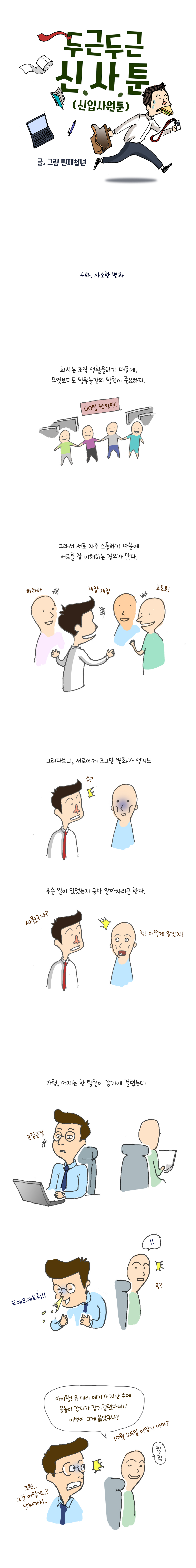 # (상황:같은 팀의 팀원들 이미지) 나레이션 : 회사는 조직생활을 하기 때문에, 무엇보다도 팀원들간의 팀웍이 중요하다. # (상황:같이 재밌게 수다 떠는 팀원들) 나레이션 : 그래서 서로 자주 소통하기 때문에 서로를 잘 이해하는 경우가 많다. # (상황:팀원의 변화를 알아채는 주인공) 나레이션 :그러다 보니, 서로에게 조그만 변화가 생겨도 무슨 일이 있었는지 금방 알아차리곤 한다. 주인공:싸웠구나? 팀원: 어떻게 알았지? # (상황:갑자기 기침을 하는 팀원A 그리고 이에 반응하는 팀원B) 가령 어제는 한 팀원이 감기에 걸렸는데.. 팀원B:아이참! 애기가 지난 주에 물놀이 갔다가 감기 걸렸다더니 이번에 그걸 옮아왔구나? 팀원A:아니 그걸 어떻게..