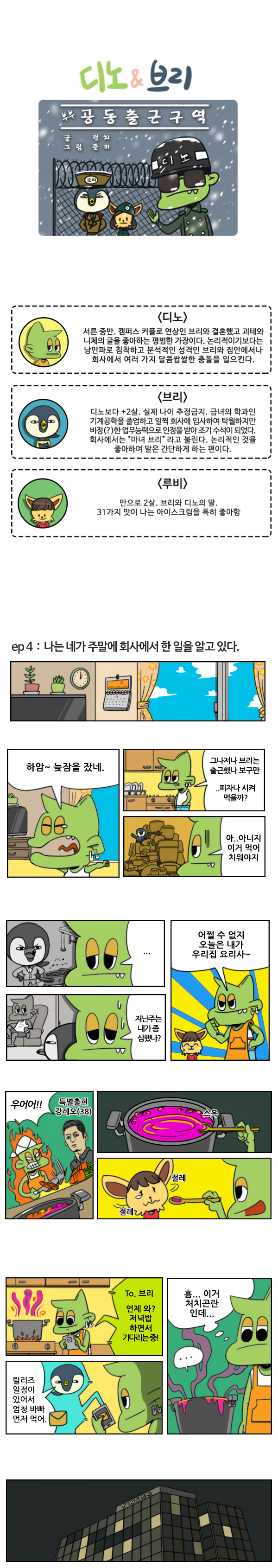 (ep 2) ## 나레이션 : 주말 이른 오후 상황 : 기지개를 키며 배를 들어낸 채 부엌으로 나오는 디노 디노 : 아함. 늦잠잤네. 그나저나 이 아가씨. 또 회사 출근했나 보구만. (side) 배고픈데 피자나 시켜먹을까? ## 상황 : 부엌에서 녹고 있는 음식물들을 바라보면서... 디노 : 아니지. 이거 먹어치워야지. ## 상황 : 어제의 브리의 짜증을 회상하면서 생각에 잠기는 디노 브리 : 먼저 왔으면 집안일 좀 해놓지. 디노 : (역시 보지 않은 채)미안. 축구경기 끝나면 하려고 했지. ## 디노 : (앞치마를 두르면서 목마를 타고 있는 루비에게 찡긋) 어쩔 수 없지. 내가 맛있는 요리를 만들어줘야지. 헤헤. 루비 : (걱정스러운 얼굴로) 헤헤. ## 상황 : 부엌의 남아도는 음식물을 가지고 요리를 하는 디노. ## 상황 : 형체불명의 요리가 냄비에서 조리되고 있음. 디노가 한스푼을 떠서 루비에서 먹이려고 함. 루비를 본능적으로 먹기싫어 고개를 돌린다. ## 상황 : 디노의 휴대폰 문자 디노 : 언제 와~ 저녁밥하고 기다리고 있어. 브리 : 나 오늘 연구소 릴리즈 일정이 있어서 엄청 바빠. 먼저 밥먹어 ## 상황 : 팔짱을 낀 채 눈앞의 엄청난 양의 괴수음식을 보고 고민에 빠진 디노. 디노 : 흠... 이거 처치곤란인데...