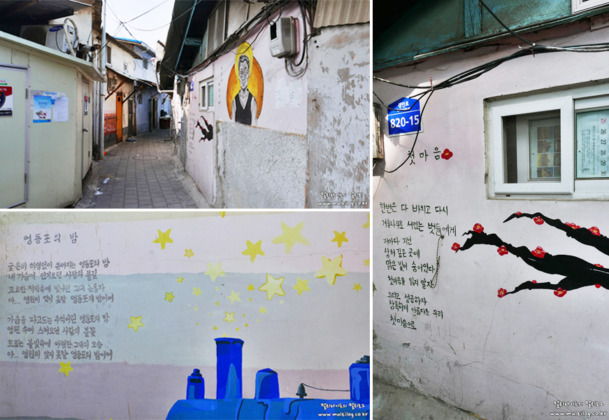 쪽방촌 골목에 그려진 벽화들. 시와 함께 그려진 그림이 곳곳에 보인다.