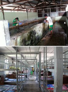미얀마 체육학교 기숙사 세면대와 기숙사 전경