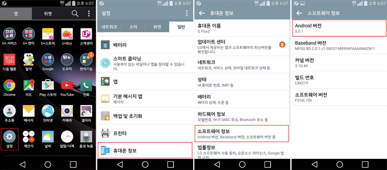 G 플렉스2 설정에서 일반 > 휴대폰 정보 > 소프트웨어 정보 > 안드로이드 버전 항목을 연속으로 터치 G 플렉스2 설정에서 일반 > 휴대폰 정보 > 소프트웨어 정보 > 안드로이드 버전 항목을 연속으로 터치
