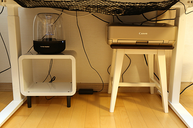스탠딩 데스크 하단에 전구와 프린터를 배치한 모습
