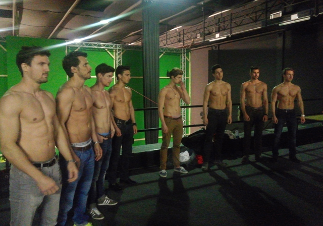 근육질의 외국인 모델 10여명이 상의 탈의를 한 채 서있다