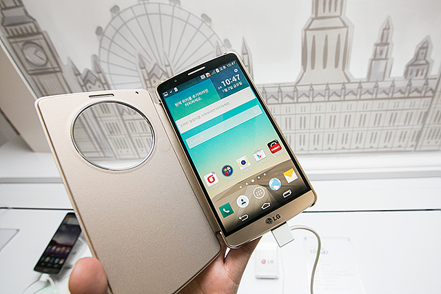 골드컬러 G3모델의 바탕화면 모습과 골드컬러의 케이스가 보인다