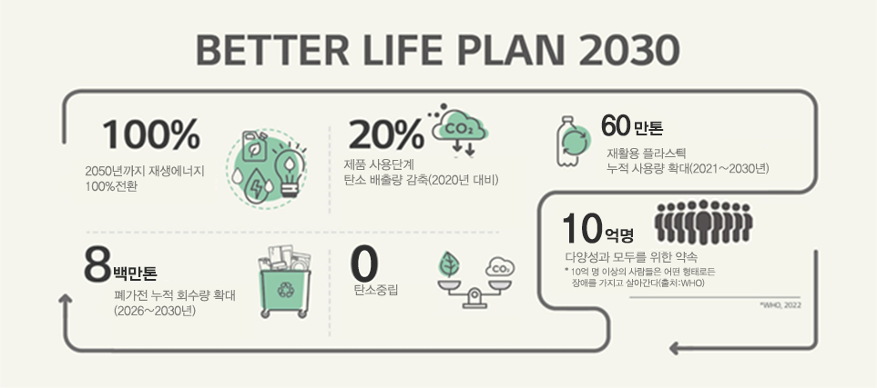 LG전자는 2022년 중장기 ESG 비전인 ‘Better Life Plan 2030’을 발표하며 지속 가능한 미래를 위한 실천 전략을 제시했습니다. 환경을 위한 ‘3C(탄소중립·자원순환·친환경 기술)’와 사람 중심의 ‘3D(안전한 사업장·다양성과 포용·접근성 향상)’를 통해 총 6대 과제를 중심으로 ESG 활동을 추진하고 있습니다. 이러한 철학은 제품과 서비스에도 자연스럽게 반영됩니다.