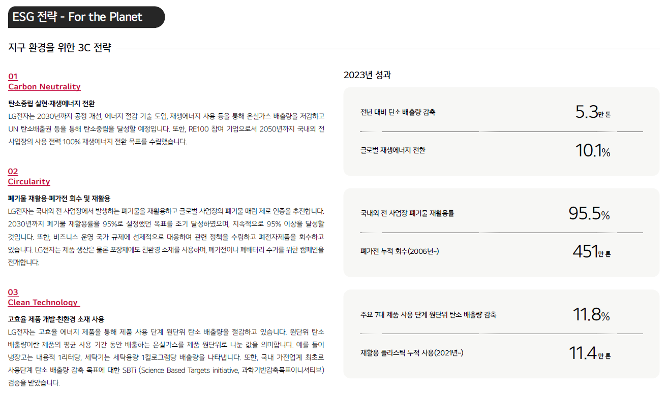 LG전자의 ESG는 ‘Better Life for All’이라는 비전을 중심에 두고, 환경과 사람을 연결하는 지속가능한 삶을 지향합니다. 특히 환경 영역에서는 탄소 중립(Carbon Neutrality), 자원순환(Circularity), 친환경 기술(Clean Technology)을 중심축으로 삼고, 제품 설계에서 생산, 유통, 폐기까지의 전 과정에 지속가능성을 반영하고 있습니다. 이러한 전략은 선언에 머물지 않고, 실천으로 이어지며 수치로 그 성과를 입증하고 있습니다.