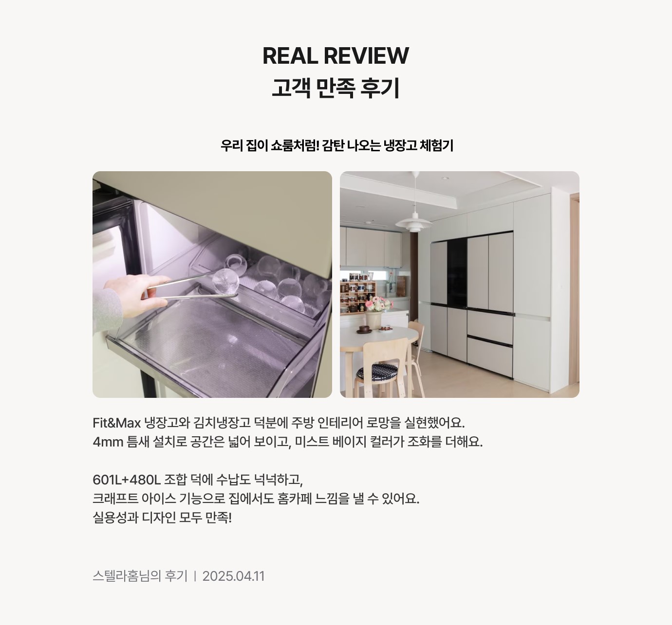 냉장고 외관 질감도 공간 분위기에 맞춰 △솔리드 스테인리스 △스테인리스 스톤 △미스트 글래스 △내추럴 메탈 중 선택 가능합니다. 실제 구매자들의 다양한 설치 사진과 사용후기는 LGE닷컴에서 자세히 확인해볼 수 있습니다.