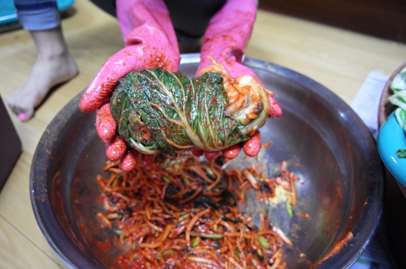 고루 다 발라진 배추는 끝부분을 살짝 꺾어 오므리고 마지막장 파란 잎으로 전체적으로 덮어 배추가 쉽게 풀리지 않게 마무리