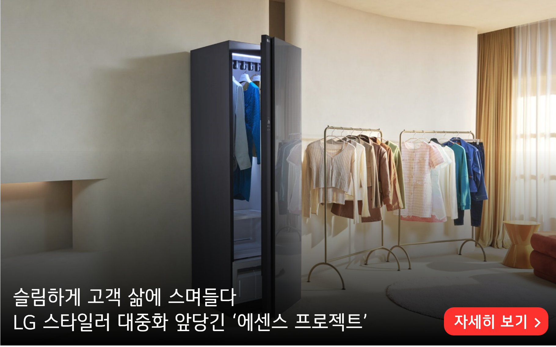 Vol. 216 담당자에게 직접 듣는 LG 스타일러 대중화의 핵심, ‘에센스 프로젝트’ 비하인드! 2025-05-06 LG전자 콘텐츠 공유하기페이스북 (새 창에서 열림)트위터 (새 창에서 열림)카카오톡 (새 창에서 열림)URL 복사 태그 4월4주차AI코어테크LGLGA9AILG스타일러LG온디바이스AISDV공감지능기술혁신무선청소기미디어텍스마트라이프에센스프로젝트위클리뉴스인포테인먼트솔루션 LG전자의 모든 콘텐츠는 자유롭게 이용하실 수 있습니다. 다만 일부 글과 이미지는 저작권과 초상권을 확인하셔야 합니다.운영정책 보기