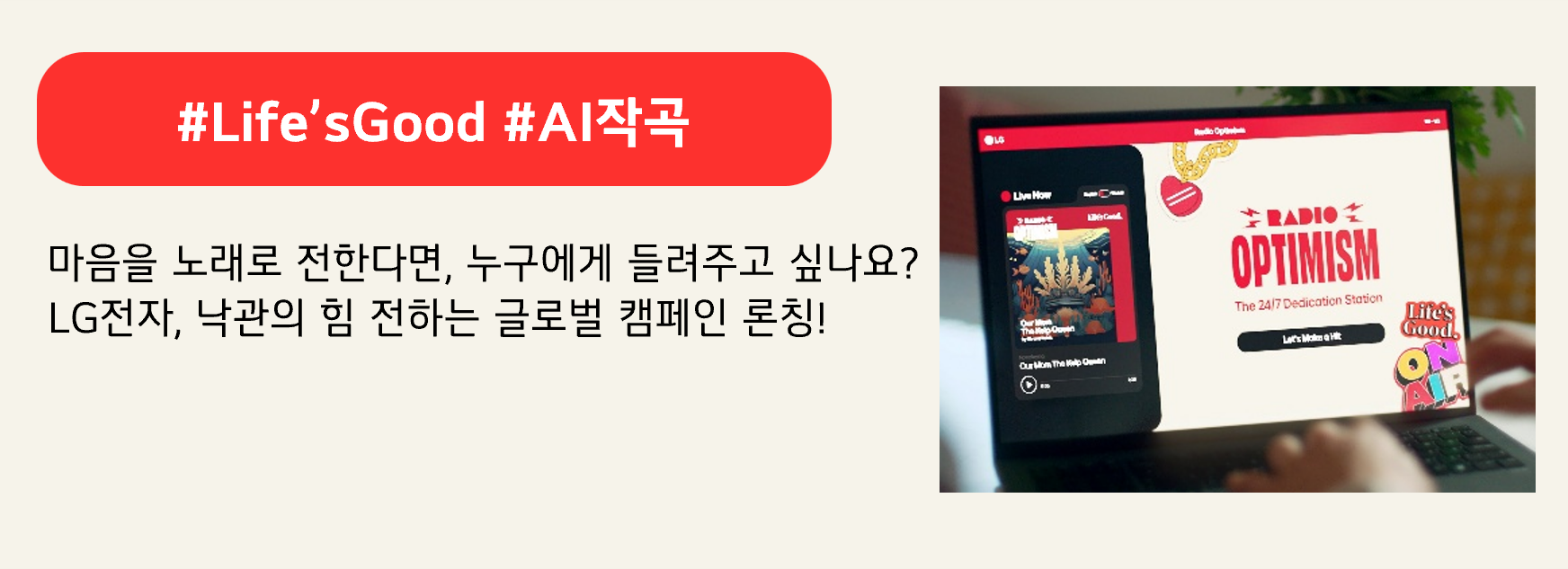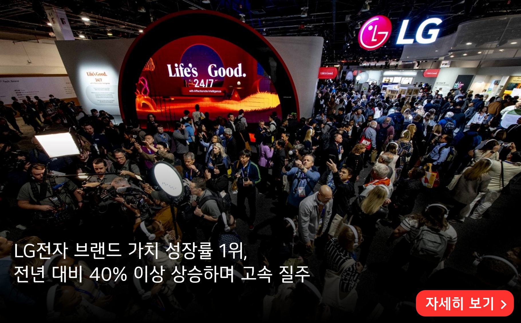 Vol.224 브랜드 가치 성장률 압도적 1위! LG전자의 질주는 계속됩니다. 2025-07-01 LG전자 콘텐츠 공유하기페이스북 (새 창에서 열림)트위터 (새 창에서 열림)카카오톡 (새 창에서 열림)URL 복사 태그 AI작곡LG시그니처LG전자Life’sGoodMOU기능성신소재낙관적태도뉴스레터대용량세탁기베스트코리아브랜드브랜드가치성장워터포지티브위클리뉴스초프리미엄프리미엄가전 LG전자의 모든 콘텐츠는 자유롭게 이용하실 수 있습니다. 다만 일부 글과 이미지는 저작권과 초상권을 확인하셔야 합니다.운영정책 보기