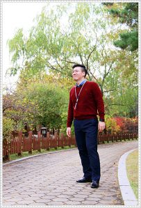 버건디 색상의 니트에 짙은 네이비 색상의 정장 바지를 입은 안재웅 사원의 모습